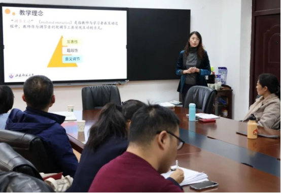活动伊始,许芃老师做了以“关于汉语口语‘调节教学’模式的探讨”为题的分享。许芃副教授分别从汉语口语“调节教学”模式的提出、基于的理念、搭建的框架、产生的效应以及对汉语口语“调节教学”的展望四个方面详尽地向与会教师们分享了有关汉语口语“调节教学”的相关研究。
