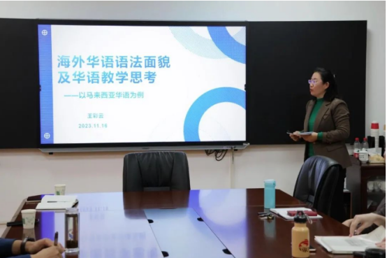 随后,王彩云老师以“海外华语语法的面貌及对华语教学的思考”为题,与各位老师分享了自己长期以来积累的关于海外华语语法面貌的经验与心得。王老师以马来西亚的两篇新闻报道片段为切入点,直观地展示了马来西亚华语面貌和普通话面貌的不同,而后阐述了东南亚华语在词汇、词法、结构三个方面的特点,并立足于国际中文教育专业的特殊性,提出了自己的思考。