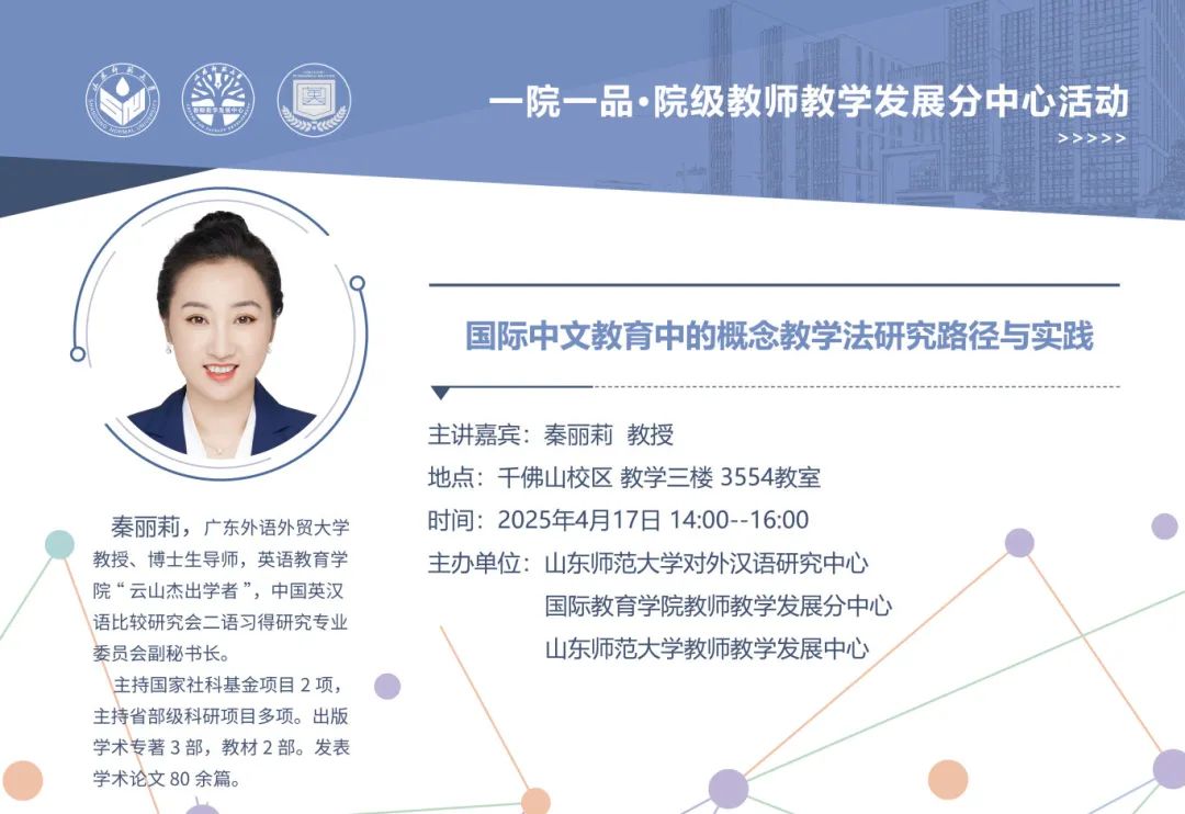 秦丽莉,广东外语外贸大学教授、博士生导师,英语教育学院“云山杰出学者”,中国英汉语比较研究会二语习得研究专业委员会副秘书长。主持国家社科基金项目2项,主持省部级科研项目多项。出版学术专著3部,教材2部。发表学术论文80余篇。