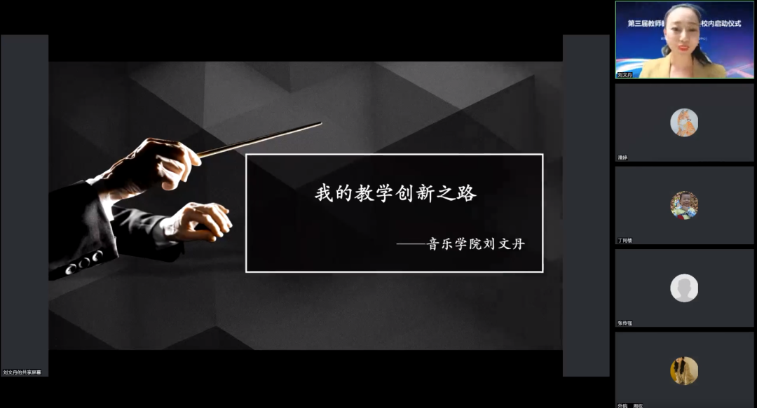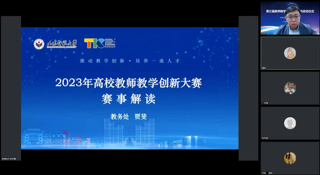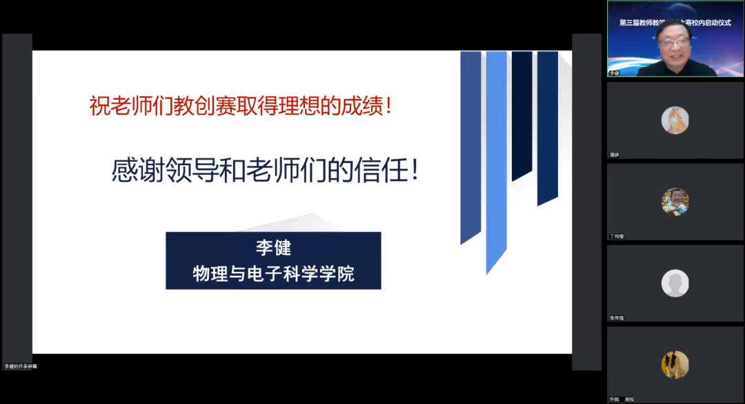 11月18日晚,教师教学发展中心(教学质量评估中心)、教务处、人力资源处(党委教师工作部)通过线上方式联合举办第三届教师教学创新大赛校内启动仪式。教务处副处长贾斐,第二届全国高校教师教学创新比赛国赛一等奖获得者经济学院宁静波老师、三等奖获得者物理与电子科学学院李健老师、数学与统计学院房莹老师,省赛一等奖获得者音乐学院刘文丹老师出席了本次会议,各教学院长、院级教师教学发展中心负责人、参加本届比赛的一线教师共计150人参加了线上启动仪式。启动仪式由教师教学发展中心(教学质量评估中心)副主任丁同楼主持。