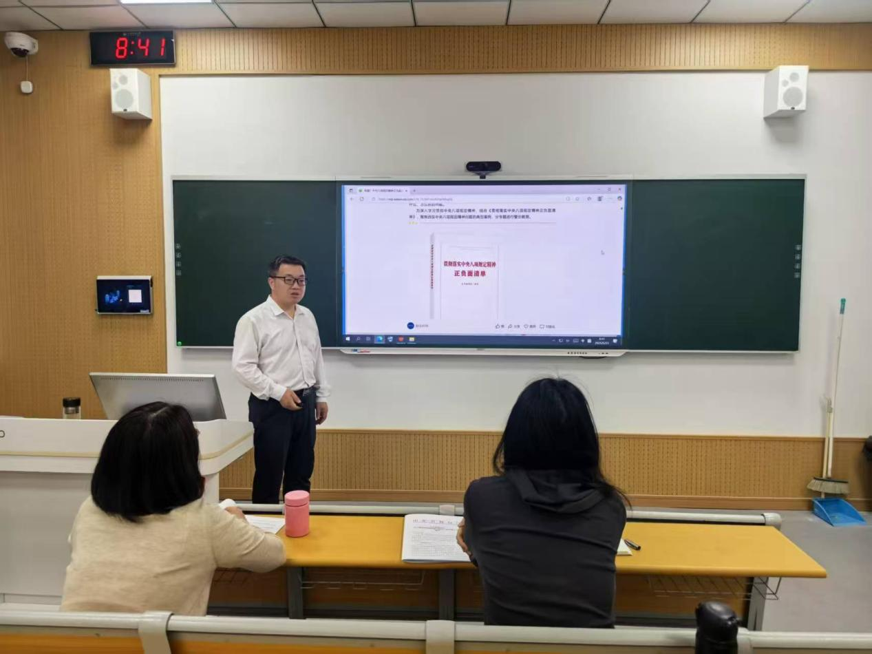 5月23日,在千佛山校区教学一号楼1145教室,教师教学发展中心(教学质量评估中心)副主任丁同楼带领中心全体党员深入学习贯彻落实中央八项规定精神,并结合工作实际,详细解读了中央八项规定精神的正负面清单,进一步强化党员干部的纪律意识和规矩意识。