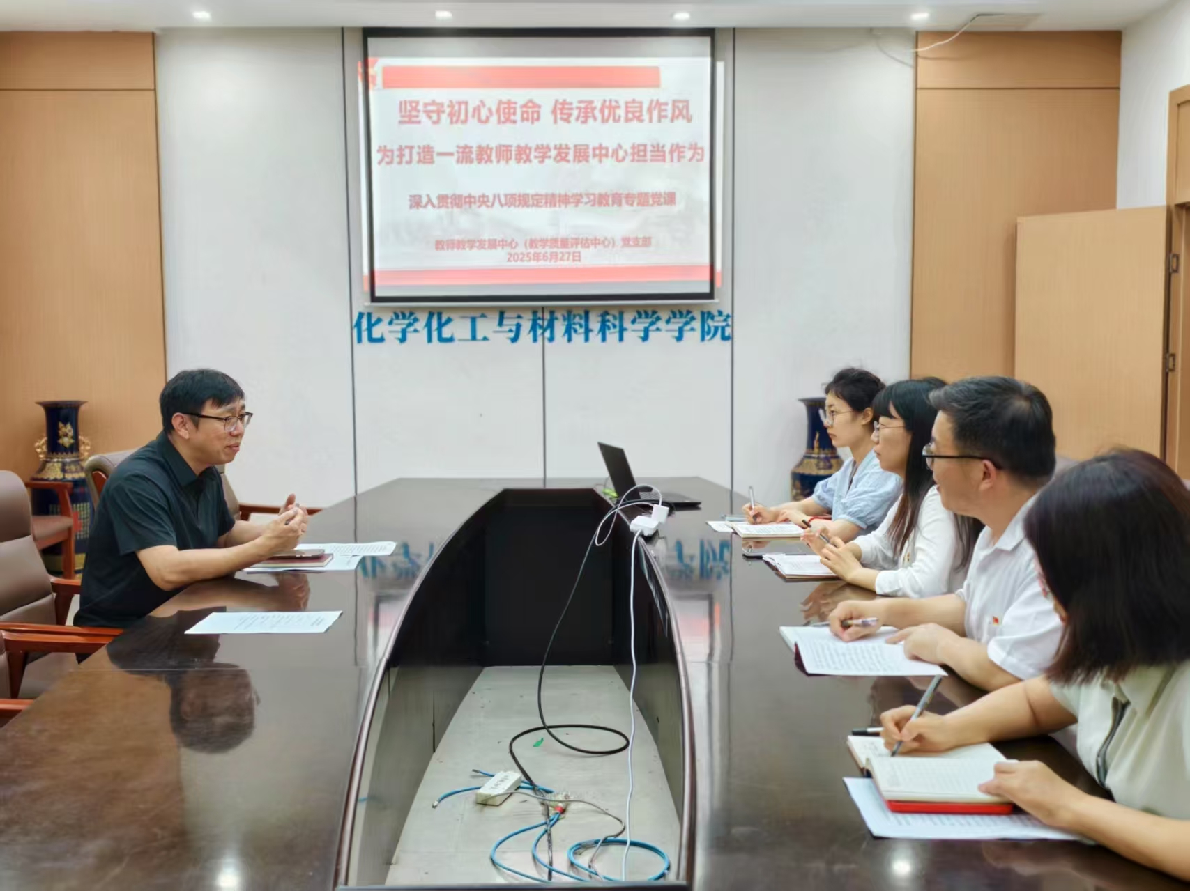 为深入学习贯彻中央八项规定精神,传承中国共产党人精神谱系,推动学校高质量发展,6月27日下午,山东师范大学教师教学发展中心主任贾斐在千佛山校区围绕一流教师教学发展中心建设,以“坚守初心使命 传承优良作风,为打造一流教师教学发展中心担当作为”为题,为中心支部全体党员讲授党课。此次党课以党的百年奋斗历程为脉络,结合中心工作实际,为党员干部的成长与发展指明了方向。