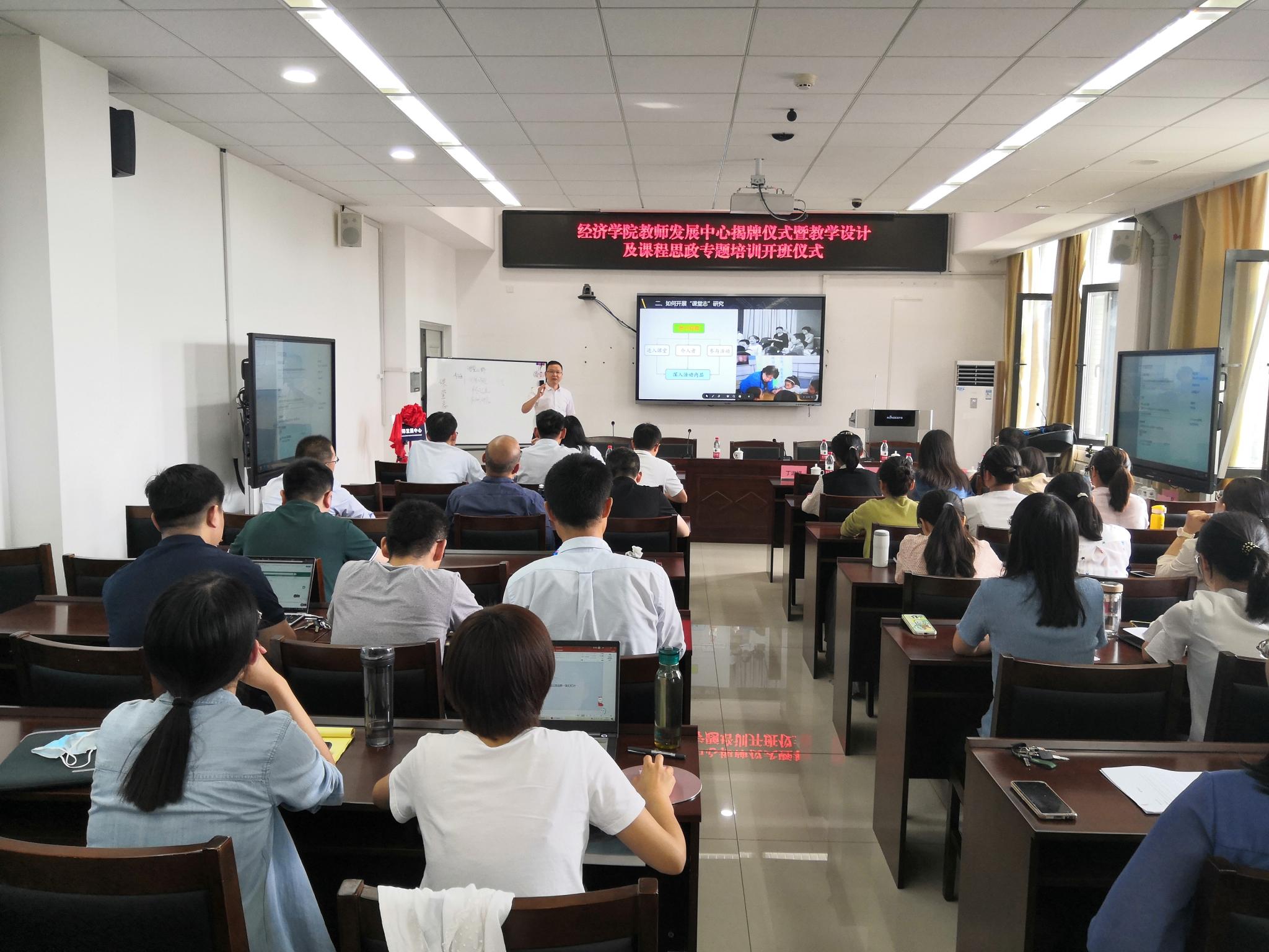 仪式结束后,教育学部柴军应老师为我院30名青年教师带来了第一场教学设计及课程思政专题培训。柴老师结合个人教学经历生动诠释了什么是课堂志、如何做好课堂志。柴老师真切的情感深深感染着每位听众,让青年教师切身体悟到情感教学的重要性,为教学设计及课程思政专题培训开班仪式画上了圆满的句号。