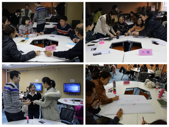 在讲到教师职业教育信念方面,小组内的成员通过搭手指活动互相认识,形成团队意识。老师们通过制作思维导图和小组分享交流的形式,进一步了解自己和他人,加深对最初职业动机和教育信念的理解。裴老师总结道,教师教育信念的基础是初心加决心加信心。