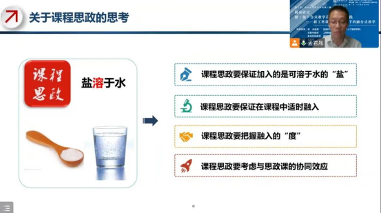本次活动分为“分享心得”、“交流研讨”、“互动问答”三大环节,孟君晟老师主持了本次沙龙,并做了分享展示。孟君晟老师对如何打造有温度、有深度的开放型课堂展开介绍。他以自身授课的教学过程为切入点,对基于BOPPPS的教学模式展开了具体论述。他指出,混合式教学应遵循目标导向原则,与课堂翻转相结合,综合采用多种策略,从而全面提升学生的学习体验。最后,孟君晟老师对课程思政进行了四点总结:一是课程思政要“如盐入水”;二是课程思政要保证在课程中适时融入;三是课程思政要把握融入的“度”;四是课程思政要考虑与思政课的协同效益。