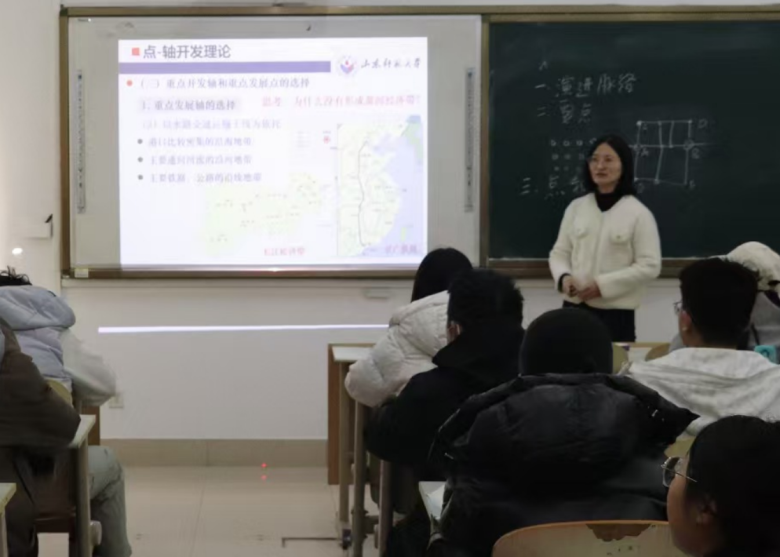 本次公开课活动分为课堂展示和课后研讨两个环节。在课堂展示环节,王鑫静老师围绕点-轴开发理论展开教学,深入讲解了点-轴开发理论的演进脉络(从据点开发理论,到轴线开发理论、节点-走廊开发模式,再到点-轴渐进式扩散理论),系统梳理了点-轴开发理论的要点,同时详细阐述了重点开发轴与重点发展点的选择依据。此外,王鑫静老师通过以“长江经济带”为例具体讲述了点-轴开发理论在中国区域开发中的实践应用,通过剖析长江经济带的区位条件、产业基础与发展定位,阐述该区域采取点-轴开发模式对区域发展产生的多维辐射带动作用,引发学生对点-轴开发模式应用价值的辩证思考。王鑫静老师的讲解不仅搭建了从区域规划基础理论到实际区域开发的桥梁,有效激发了同学们对点-轴开发模式乃至区域规划领域的学习兴趣,更通过深入阐释重点发展轴与重点发展点的选择依据,以及区域开发与战略模式之间的现实关联,引导学生逐步形成系统思维、空间分析的能力,进一步强化理论联系实际的素养,使同学们受益匪浅。