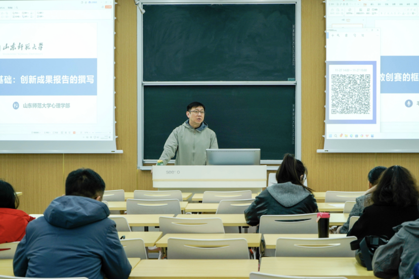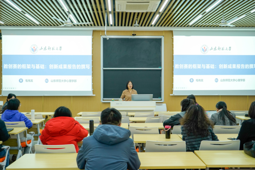 为助力教师精准把握教学创新大赛核心要求,提升教学创新成果报告撰写质量,11月27日,学校特邀心理学部毛伟宾教授于千佛山校区一号教学楼1104开展了一场主题为“教创赛的框架与基础:创新成果报告的撰写”的专题辅导讲座。讲座聚焦大赛背景、评审标准与报告撰写三大核心,以丰富案例与实操逻辑为参会教师提供了全方位指导。活动由教师教学发展中心主任贾斐主持,学校40余位教师参加。