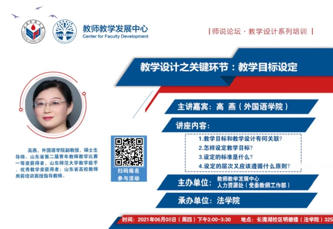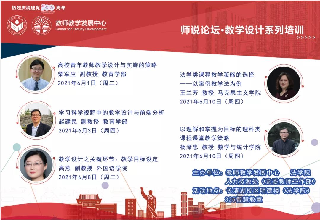 为了更集中、更细致地帮助各位老师解答关于教学设计环节的困惑,教师教学发展中心特邀请我校教育学部和各学科资深教学专家专门组建了教学设计培训团队,并将围绕“优秀案例展示”,“学情分析”,“目标撰写”,“文理科教学策略”四个主题开展五场教学设计专题培训活动,欢迎老师们报名参加!
