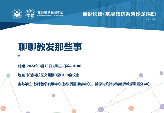 为进一步提高教师业务素质,激发基层教师组织活力,教师教学发展中心(教学质量评估中心)与数学与统计学院教师教学发展分中心联合举办师说论•基层教研系列沙龙活动。本次活动围绕教师发展工作经验分享展开,推进教师教学发展共商共研,合力共促学校教学质量提升,共同谱写教学发展新篇章。
