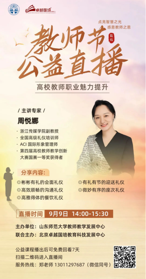 提灯引路,育梦成光。教师节将至,山东师范大学教师教学发展中心联合北京卓越国培教育科技发展中心诚挚献上教师节公益直播。本活动聚焦于高校教师职业魅力提升,将进行教育智慧分享与职业成长探讨。在这个特别的节日里,让我们共同前行,传递爱与知识,一起点亮教育之光,照亮前行之路,让爱与智慧永续传递。