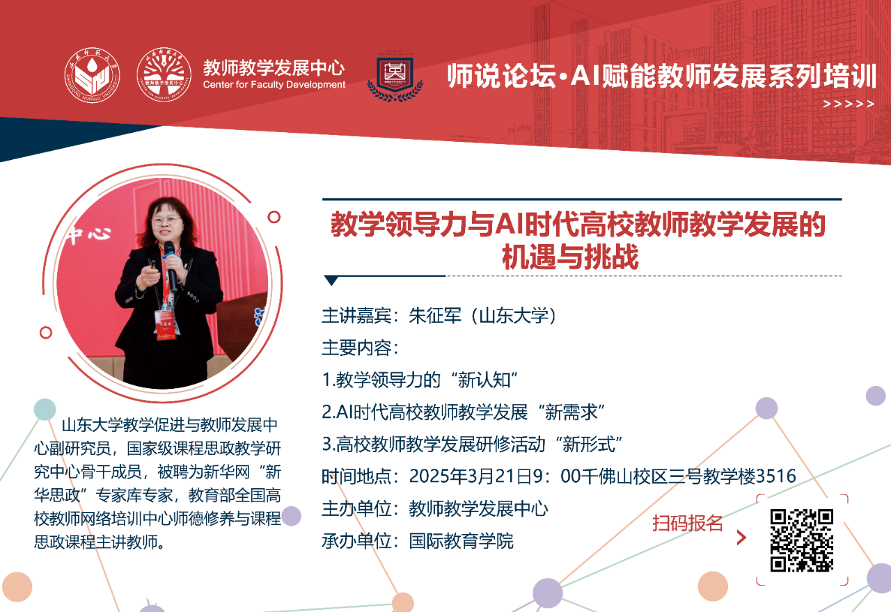 朱征军,山东大学教学促进与教师发展中心副研究员,国家级课程思政教学研究中心骨干成员,负责教师教学研修项目的设计策划与组织实施,承接多项大规模山东省高校教师教学能力提升培训项目,被聘为新华网“新华思政”专家库专家,是教育部全国高校教师网络培训中心师德修养与课程思政课程主讲教师。获教学技能工作坊ISW、引导员技能工作坊FDW和培训师TDW证书,具有丰富的教师教学主题讲座主讲与教学技能工作坊引导经验,担任过西南财经大学、国防科技大学、北京理工大学、江南大学、内蒙古工业大学等三十多所高校ISW和FDW工作坊的引导员和培训师。主讲教师教学讲座或工作坊主题包括课程思政教学设计与实施、AI与课程教学创新与重构、参与式教学策略、青教赛与教创赛的备赛策略、学生学习成效评估、依法执教、教学伦理等。