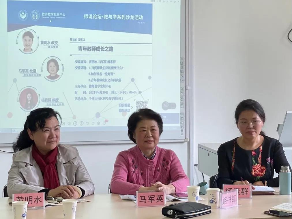“百优课”教学观摩活动正如火如荼进行,各学院积极响应,为了进一步促进教学名师与青年教师之间的交流,发挥优秀教师的示范引领作用,4月30日下午于千佛山校区教学楼4511教师教学发展中心主办了“师说论坛·教与学系列沙龙活动”《共话百优课之青年教师成长之路》。特邀数学与统计学院马军英教授、音乐学院黄明水教授以及马克思主义学院杨素群教授担任主讲嘉宾,教学院长代表路书红、李佳,百优课主讲教师代表赵东芹、柴军应、王秀香,各学院近20位中青年教师参加此次活动,活动由教师教学发展中心王新华主任及教师发展科潘婷老师主持。