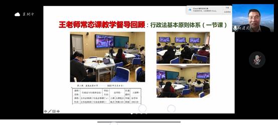 在点评环节,赵建民结合王丽晖线下课堂与本次线上观摩课的授课情况综合分析,通过课件展示,客观形象地对本次课堂的教学理念与教学设计进行了点评,总结出此次观摩课的四点典型特色:案例引导体现课堂教学的学生中心、问题分析达成课堂教学的高阶目标、分层讲解架构课堂教学的内容框架、对话教学使用腾讯会议的互动工具。建议青年教师进行学习借鉴。