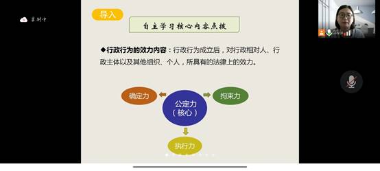 课堂展示环节,王丽晖运用腾讯会议进行线上授课,同时借助超星学习通平台开展主题讨论、随堂练习等课堂互动,学生集中于法学院教室共同学习。本次课程为《行政与行政诉讼法》中“行政行为的效力内容”。首先,王丽晖通过案例分析引导学生进行课前回顾,对重要知识点复习强化,并注重课程思政元素的挖掘,引发学生对服务型政府话题的思考。随后,在简要总结学生自主学习核心内容基础上,对行政行为的效力内容进行细致讲解,讲授新课过程中侧重教师与学生双向互动,培养发散性思维。课堂小结部分,设置思考题与拓展阅读两个部分,培养学生学以致用以及探索式进阶学习的能力。本次课堂结构完整,内容丰富,深入浅出,层次分明,综合运用多个线上教学平台,借助随机选人、投票等新形式提高学生的课堂参与感,达到良好的课堂效果。