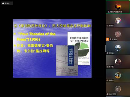 常庆此次讲授的课程是《传播学概论》,他介绍了报刊的四种理论中的前三个理论,即集权主义理论、自由主义理论、社会责任理论。他从赛博特和施拉姆著作《报刊的四种理论》出发,讲述了四种理论的产生由来和背景。常老师不仅讲授了理论,还引导学生树立正确对待理论的态度。这些理论“既是历史性的描绘也是现实性的概括”,他认为大众传播是西方工业文明的产物,因此相关的西方理论不可避免带有意识形态的偏见和科学伦理的缺陷,我们只能将其作为参考和借鉴,不能毫无保留地视作真理。常老师将枯燥的理论讲述得生动有效,受到听课教师和学生们的一致好评。