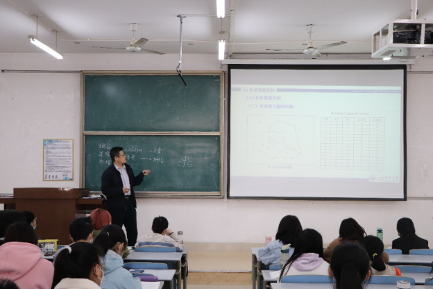 授课开始,常军老师带领同学们简单回顾了空间数据模型内容,然后重点围绕GIS空间数据结构中的矢量数据结构展开本节课内容讲解。课程内容由浅入深、层层剖析,授课过程结合板书+提问互动,既提高了学生接受度,又拓展了知识的深度,学生反响热烈。