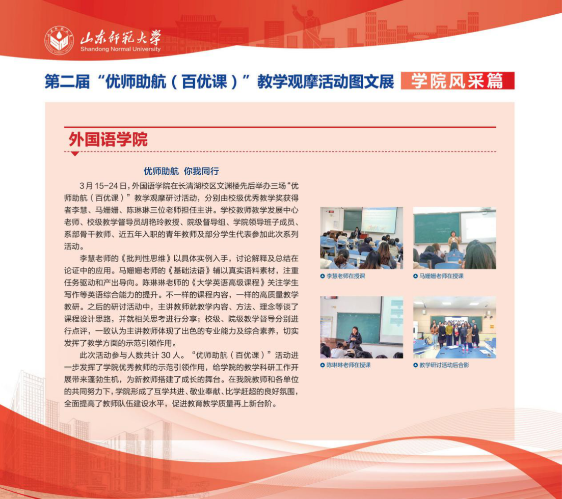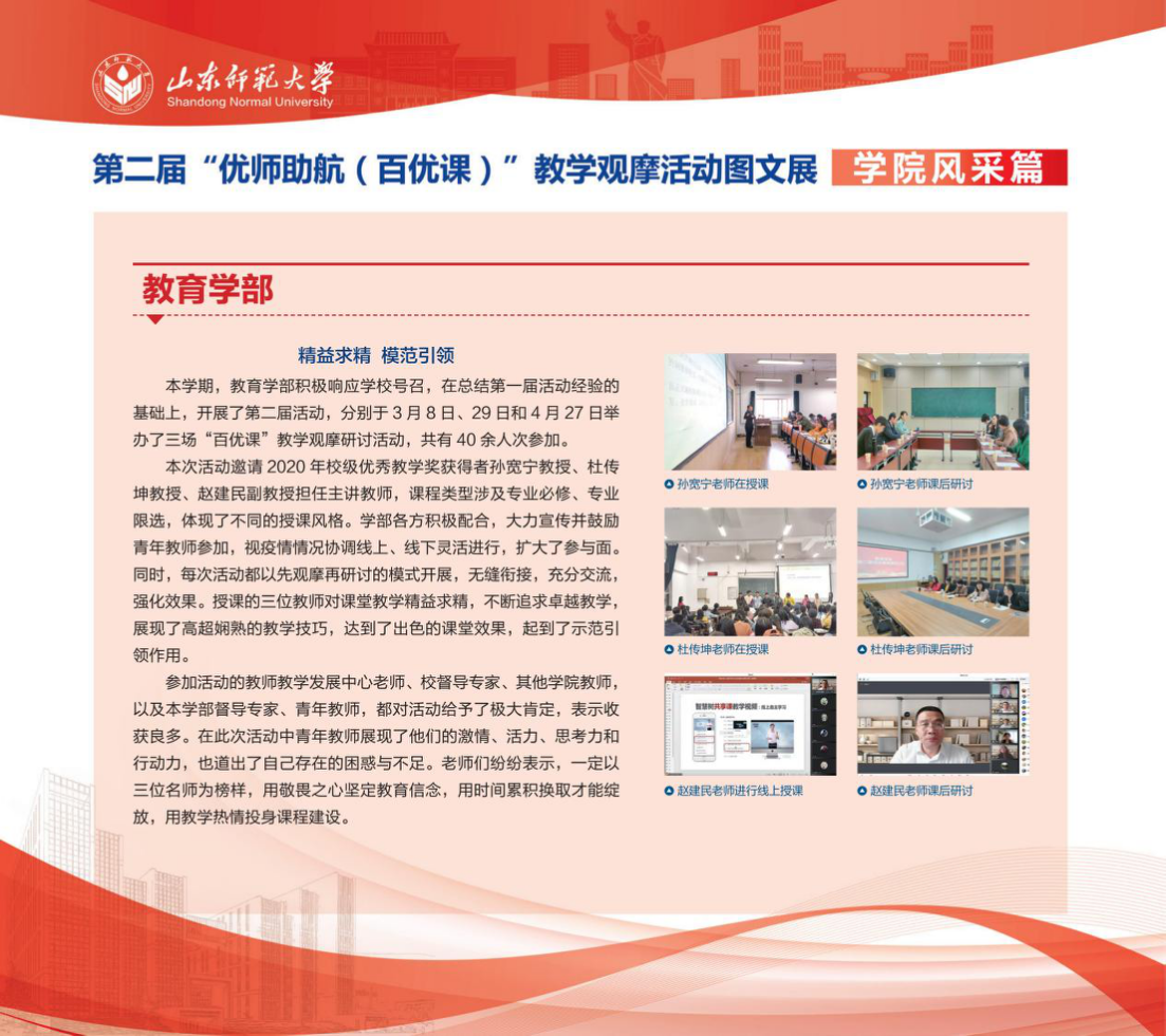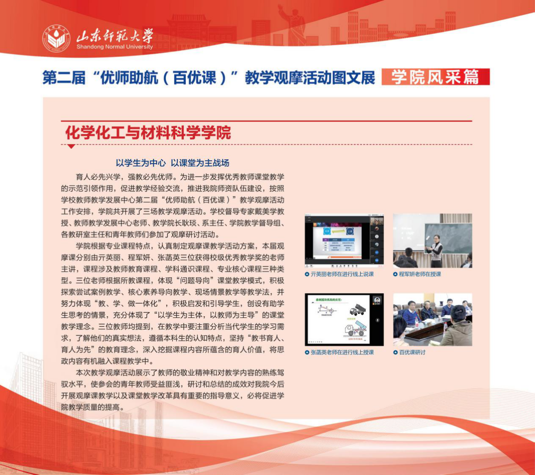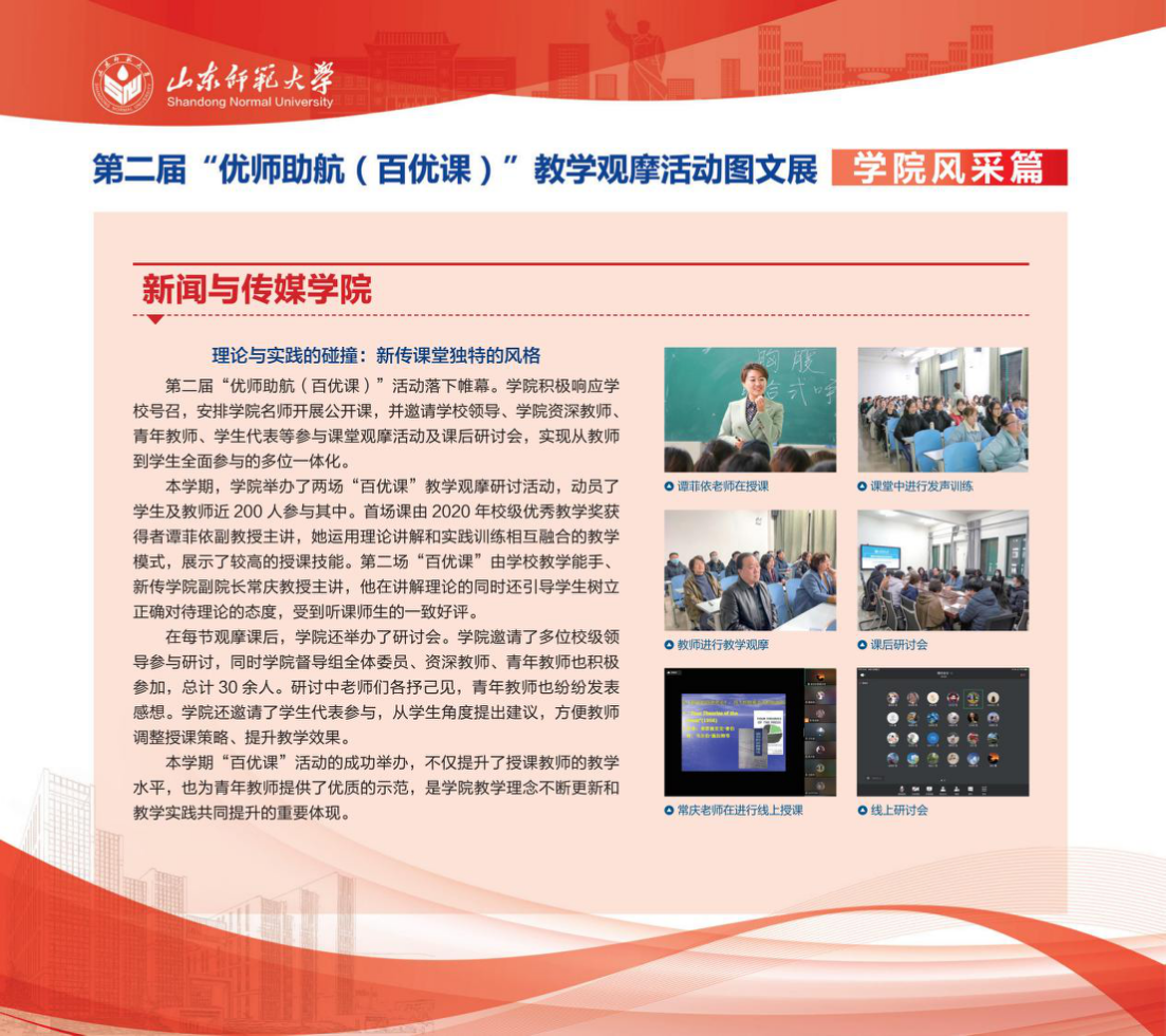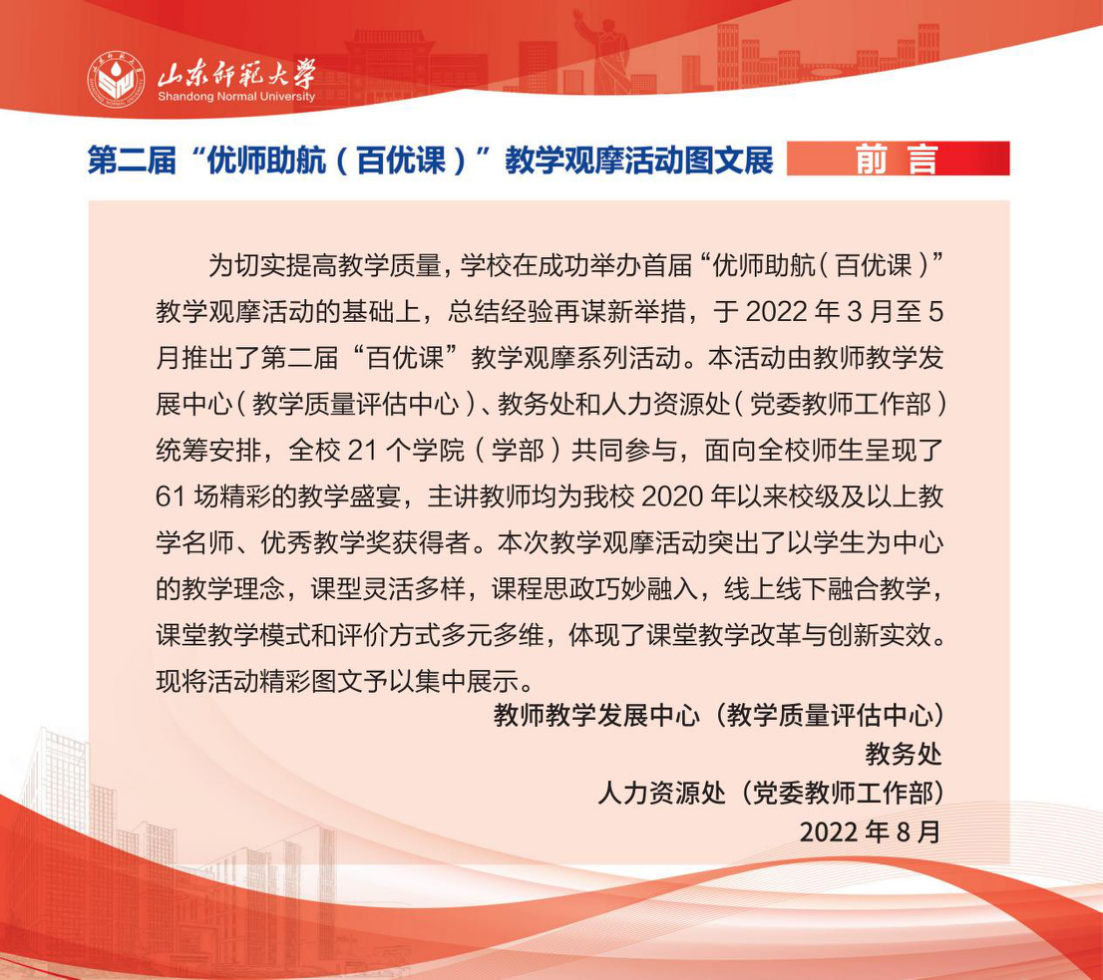 2022年3月至5月,学校推出了第二届“优师助航(百优课)”教学观摩系列活动。教学观摩活动突出了以学生为中心的教学理念,体现了课堂教学改革与创新实效,近五年入职的青年教师广泛参与,在全校师生中引发热烈反响,为更好地展示优秀教师风采,推广活动成效,现将活动精彩图文予以展示,同时在两校区宣传栏同步展出。