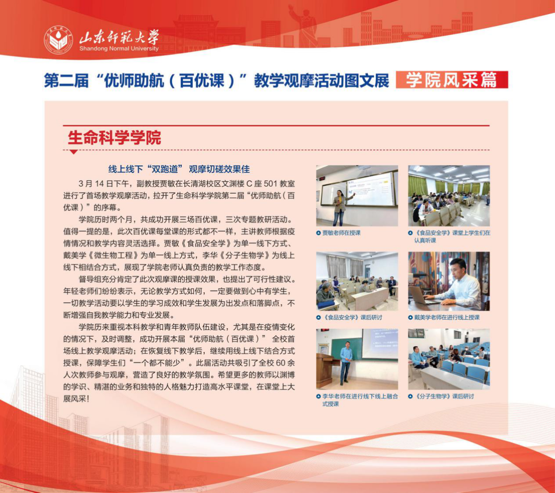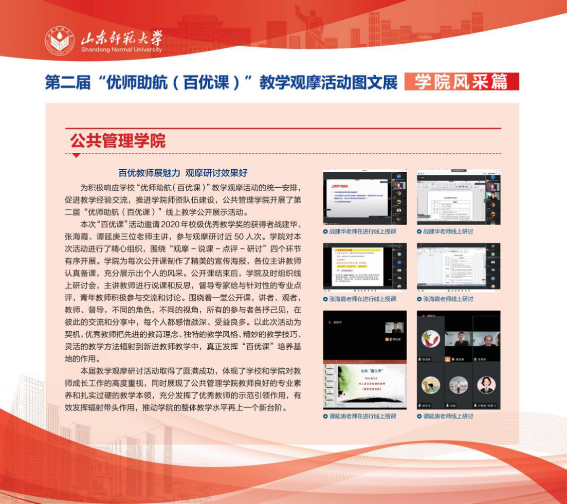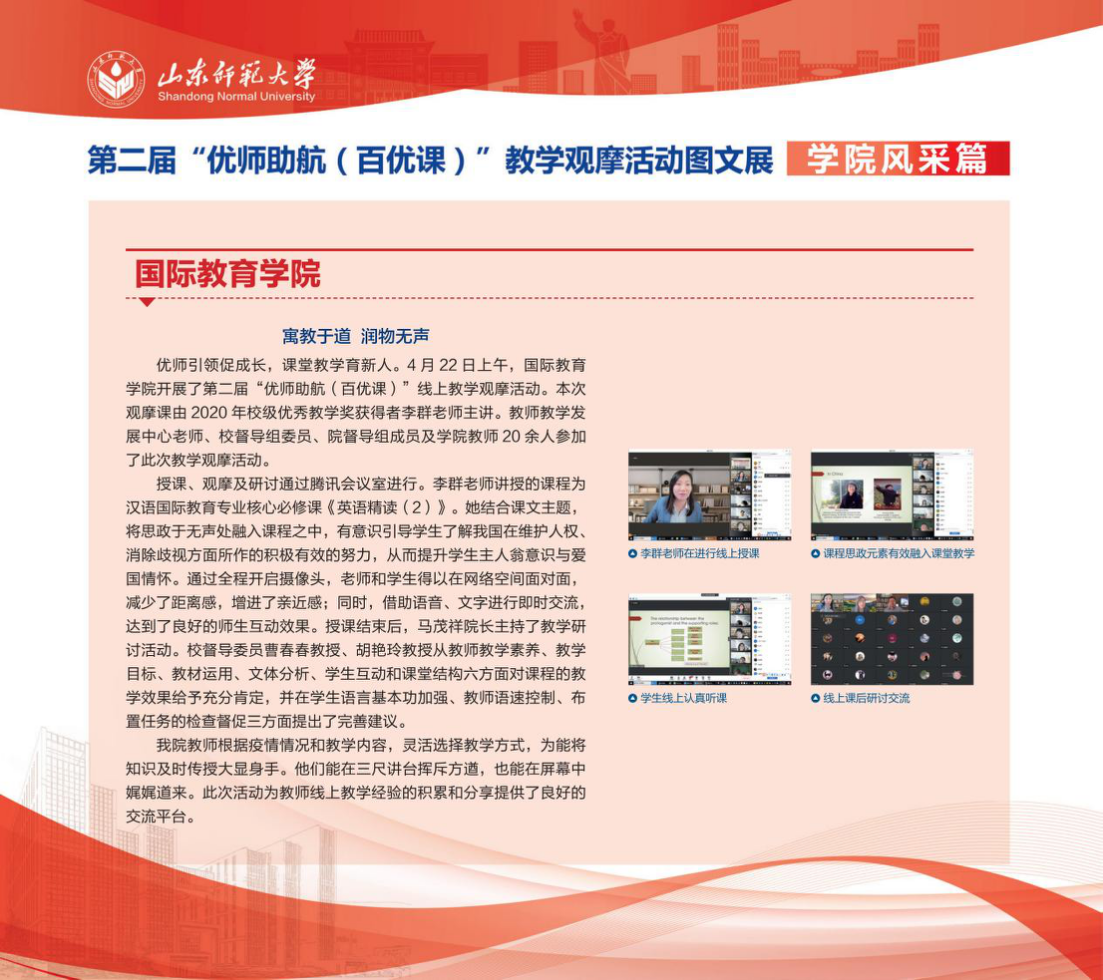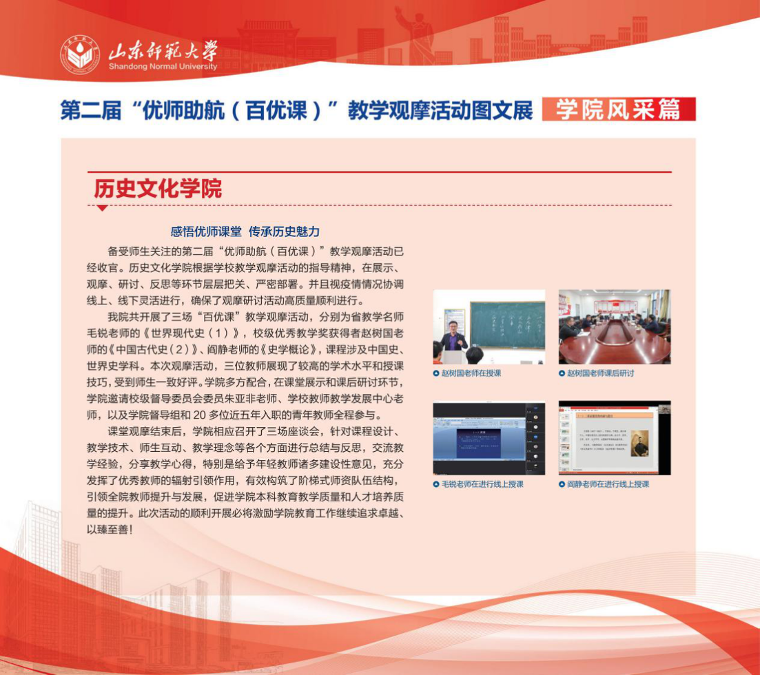 2022年3月至5月,学校推出了第二届“优师助航(百优课)”教学观摩系列活动。教学观摩活动突出了以学生为中心的教学理念,体现了课堂教学改革与创新实效,近五年入职的青年教师广泛参与,在全校师生中引发热烈反响,为更好地展示优秀教师风采,推广活动成效,现将活动精彩图文予以展示,同时在两校区宣传栏同步展出。