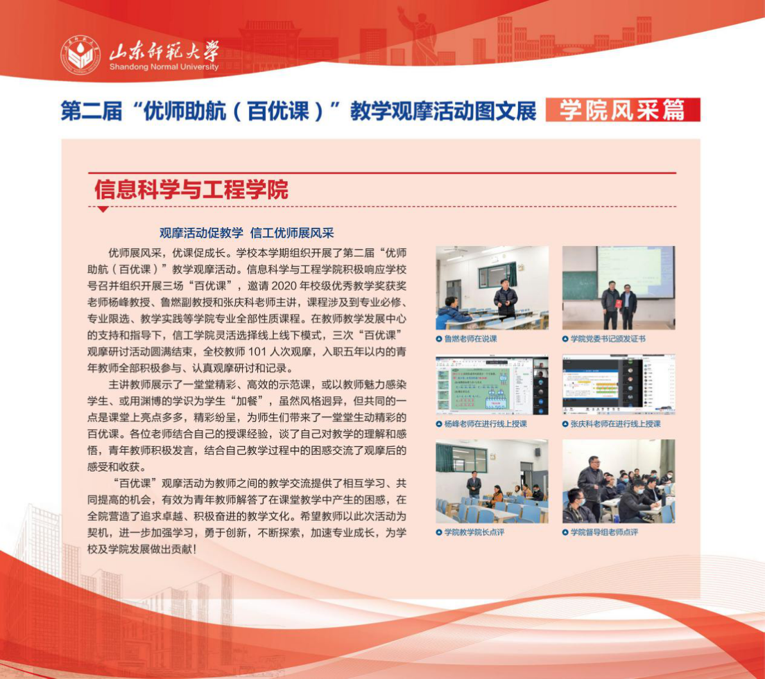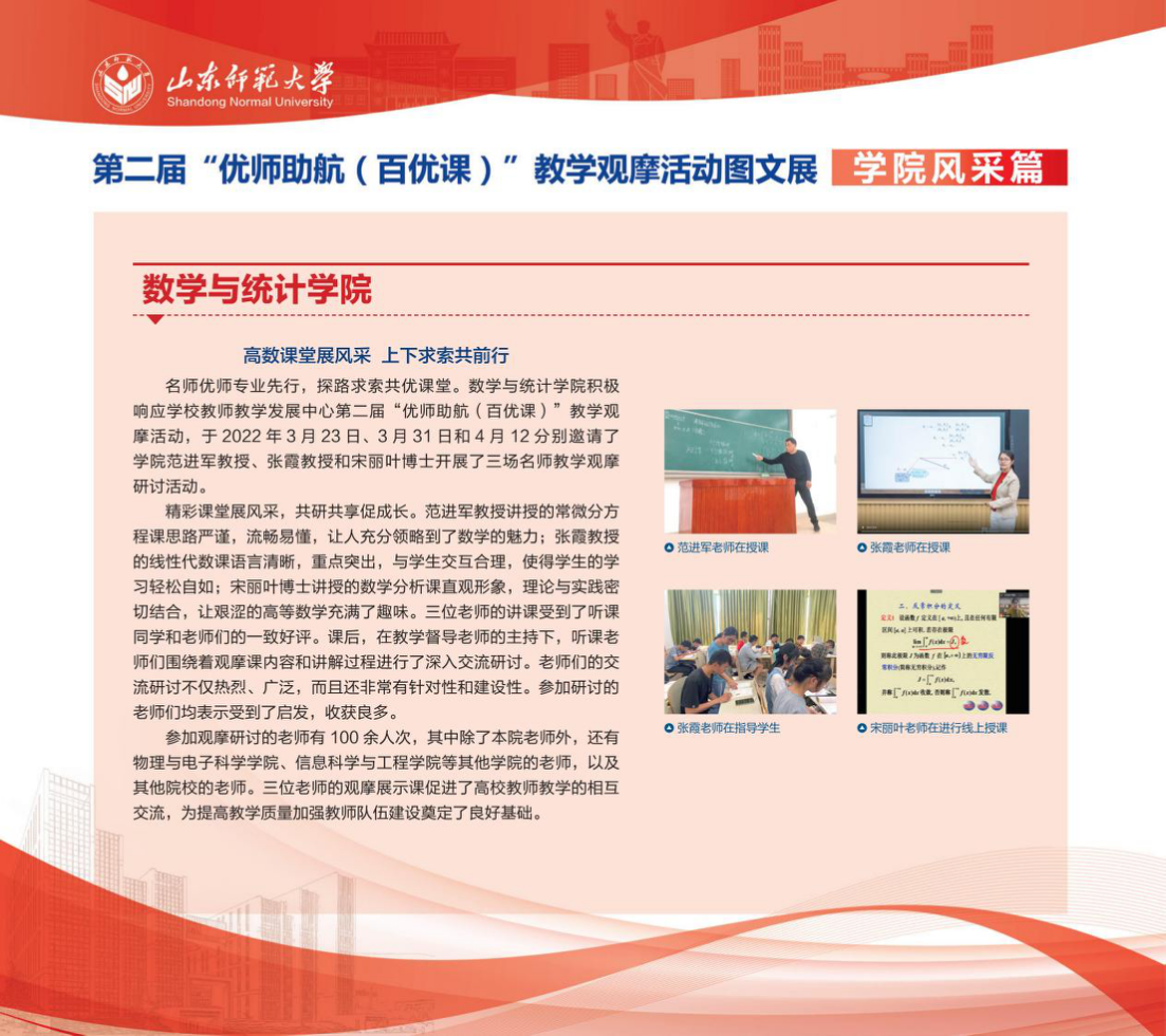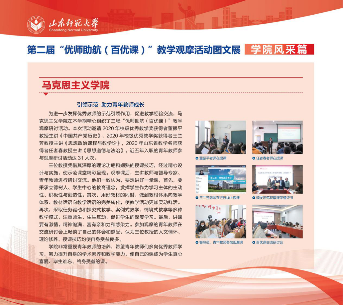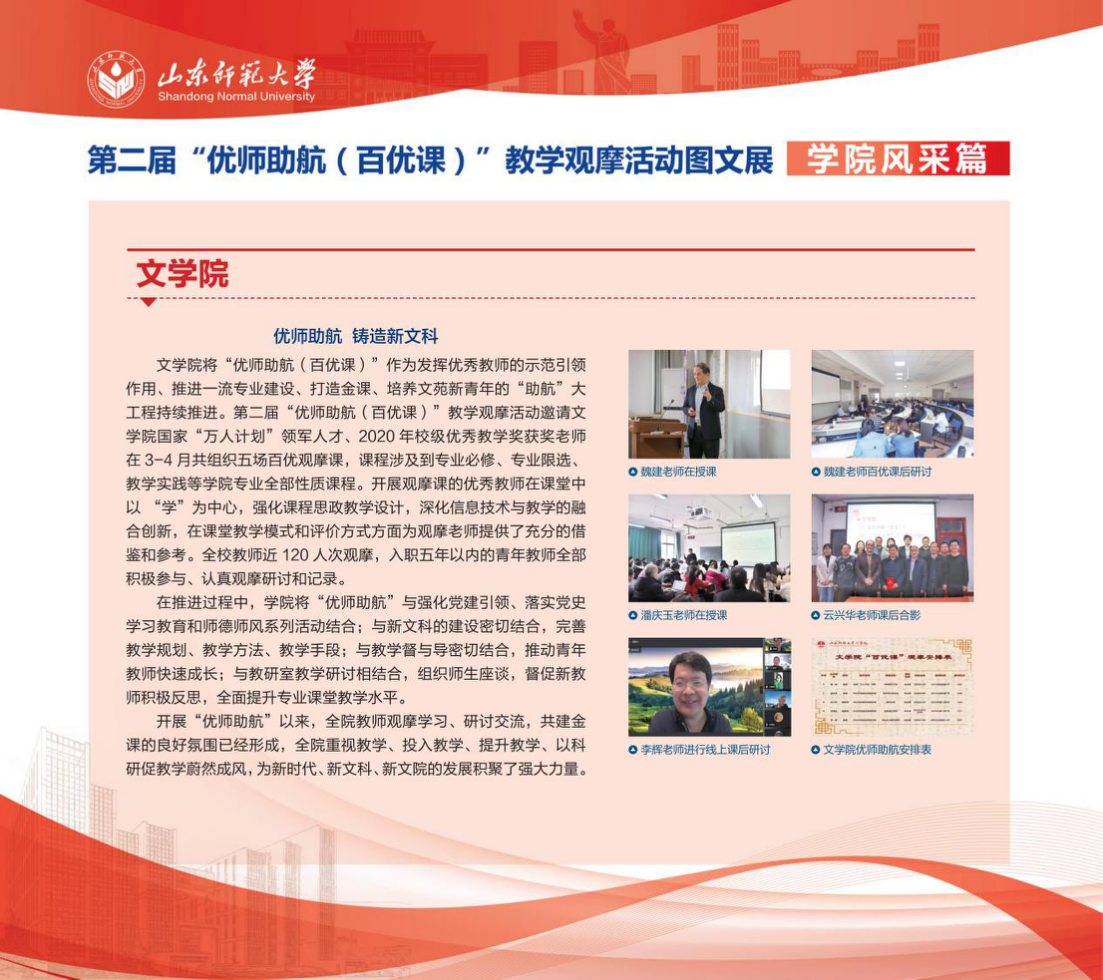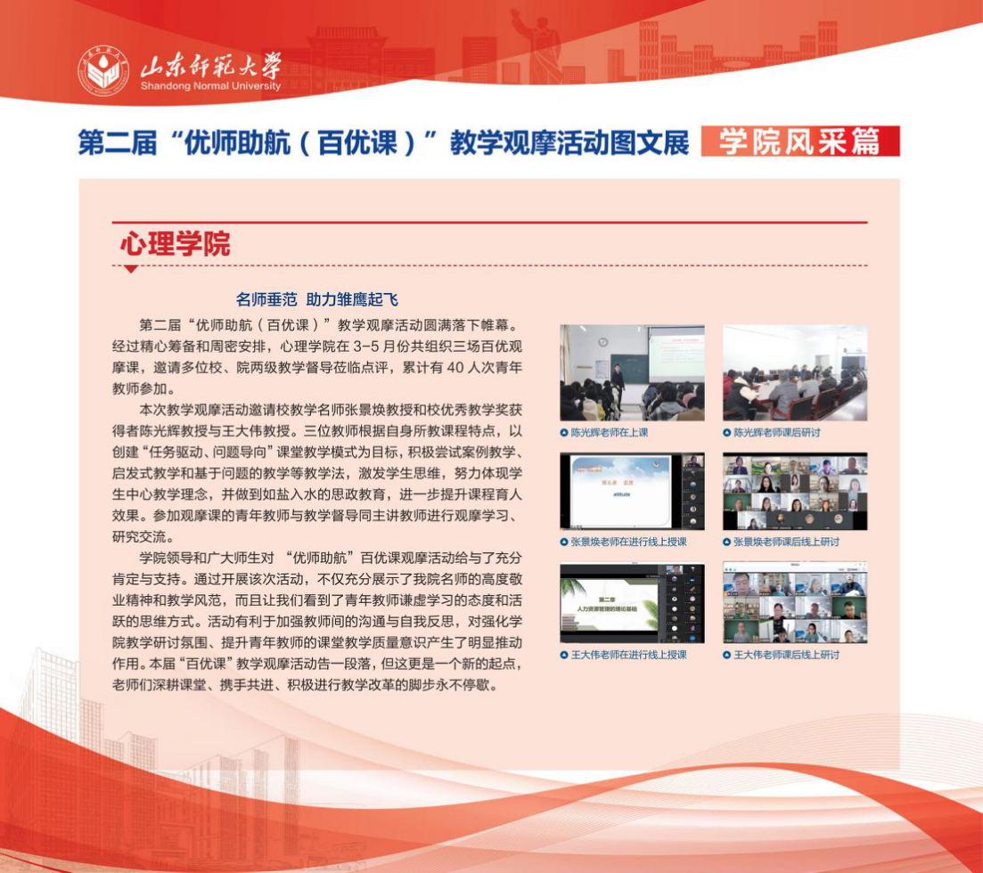 2022年3月至5月,学校推出了第二届“优师助航(百优课)”教学观摩系列活动。教学观摩活动突出了以学生为中心的教学理念,体现了课堂教学改革与创新实效,近五年入职的青年教师广泛参与,在全校师生中引发热烈反响,为更好地展示优秀教师风采,推广活动成效,现将活动精彩图文予以展示,同时在两校区宣传栏同步展出。
