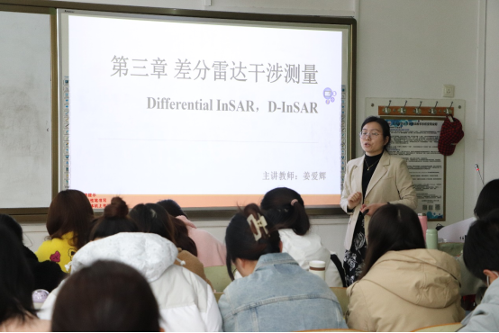 授课开始,姜爱辉老师带领同学们简单回顾了相位质量评价指标以及干涉图的特点,然后重点围绕差分干涉的基本原理展开本节课的讲解。课堂由浅入深,理论结合实际,还通过分析雷达影像调动学生积极性,同时拓展了知识的深度。姜爱辉老师声音洪亮,整个课堂条理清晰,详略得当,逻辑性强,授课过程结合板书、提问互动,既加深了学生了解,又拓展了知识的深度,学生反响热烈。