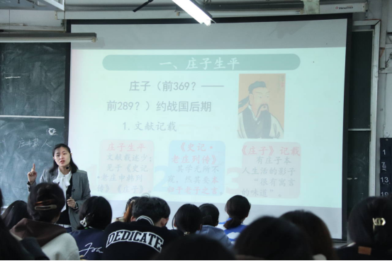 苗江磊老师的教学观摩活动分为课堂展示和课后交流两个环节。在苗江磊老师的引导下,课堂由学生进行“庄子寓言”课堂汇报展示为起点正式开始。根据学生汇报内容,苗江磊老师对其进行简要点评,紧接着以庄子其人、《庄子》一书为内核,深入浅出地讲述庄子生平、庄子与楚文化的渊源关系、《庄子》寓言故事和《庄子》思想及后世影响,在与学生的互动中系统阐述庄子和其论著的广泛影响,为学生营造轻松愉快课堂氛围的同时,达到促进学生对中国古代名家名作的理解、吸收和应用的教学目标。