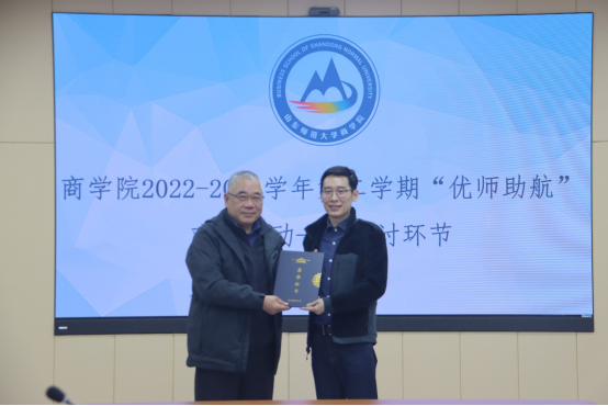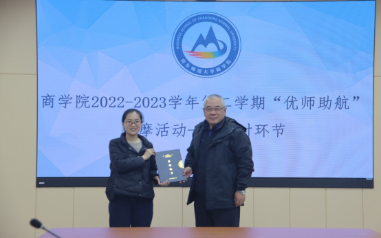 课堂展示结束后,参加观摩课的老师们前往文济楼549开展教学研讨,会议由刘丽娜主持。柳兴国首先在教师教态,课堂布局,情景导入等几个方面对李扬老师和随培培老师的教学进行了高度评价,他认为两位教师的课堂内容设计合理,坚持问题驱动,激发了学生的自主学习能力,实现了师生之间有效互动。同时也指出了教学中出现的一些问题。他指出,在课堂设计方面,引入环节要兼具趣味性与专业性,引发学生学习兴趣的同时要与本专业紧密相扣;课程教学要紧扣引入环节,将引入的案例贯穿整节课堂,注重课堂的整体性;思政的融入要自然顺畅;重视课堂时间的把控,避免出现分析时间过长,分析过程不够清晰的现象。最后,柳兴国发表了本次活动对他产生的启发与建议。他认为,教学过程中要在采取多样的分析方法的同时体现钻研的深入,从而增加课堂的厚度,提高课堂逻辑的严谨性,把握好教学细节的同时也不能忽略课堂的整体性。还指出在课堂设计中要体现层次性,可以通过改进ppt和课堂语言进行分点分析,避免信息点的罗列对学生产生的压迫感,层层递进的引导才能使得知识脉络更加清晰。研讨结束后,柳兴国为李扬和随培培颁发证书。