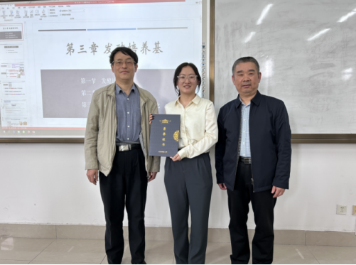 孙爽老师主讲的《微生物工程》是生物技术(国际联合培养)专业学生首次系统的学习工程类课程,该课程在教学过程中注重将理论基础和实际生产应用相结合,在提高学生科学素养的同时强化工程思维训练,培养学生勇于创新的科研精神和实践能力。本次授课内容为第三章第一节“发酵培养基”,主要讲授了发酵培养基的类型和发酵培养基成分的来源及控制。整个授课过程中,孙爽老师教学思路严谨,语言清晰流畅,注重与学生的互动,自然而然的将课程思政内容渗透到课堂教学中。教学结束后,张永胜和孟庆田为孙爽颁发荣誉证书。