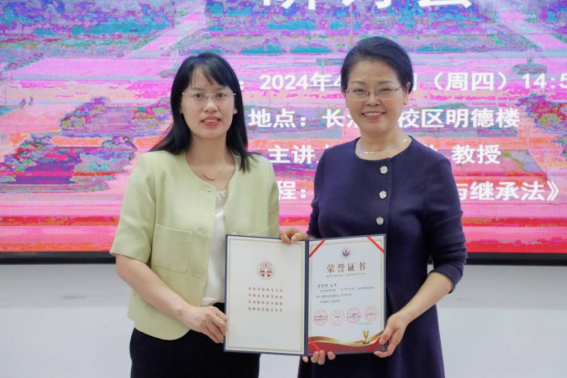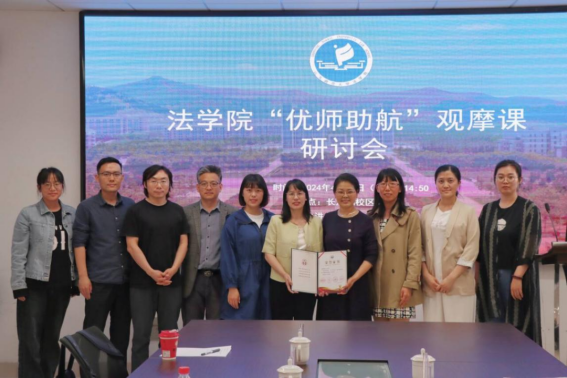 课堂展示结束后,参加公开课的老师们于明德楼403会议室开展教学研讨,会议由王德新主持。首先,曾彩琳结合课堂教学进行自我剖析,对教学准备、课堂表达与混合式课程中的细节进行了全面的分析与反思,并对未来的持续完善提出了设想。接下来,杨素群对曾彩琳的教学能力进行了充分肯定,认为曾彩琳教学态度严谨,语言逻辑清晰,展现了优质课、领航课的特点,其课程内容层层递进,知识讲解透彻,有机融入课程思政,增加了课程的深度与广度。同时,她还针对课堂热度、讲课语速等方面提出了具体的建议。校院两级教学督导组成员及青年教师代表依次进行发言,就此次课程的上课体验、学习心得、完善建议发表了看法,并针对曾彩琳以真实案例加深学生知识点认知和巧妙融合思政元素的授课方式表示赞扬。最后,潘婷对曾彩琳的授课给予积极评价,肯定了法学院对优师助航课的重视和有效组织,并鼓励年轻教师不断学习优秀教师的授课经验,提升教育教学水平,助力学院建设高质量教师队伍。研讨结束后,杨素群为曾彩琳颁发证书。