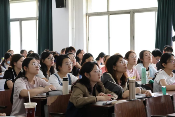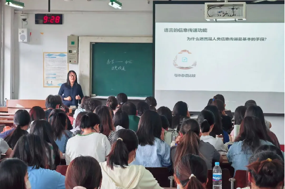 第二场教学观摩活动由徐晶晶老师主讲,所授课程为语言学概论。她从有趣的动画猜谜视频入手,巧妙地导入了本节课的关键内容——语言,并通过大量举例和形象比喻阐述了“社会”“语言”“言语”等相关概念,结合生动的PPT展示和清晰的板书设计,讲解了语言的信息传递功能、人际互动功能、社会构建和社会认知功能等具体内容。在此基础上,徐晶晶老师由浅入深,层层递进地引导学生思考、与学生互动交流,情理并重,学理交融,使学生们在学习专业知识的同时也提高了创新思维。