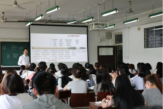 第一场教学观摩课由骆牛牛老师主讲,所授课程为汉外语言对比。课堂展示阶段,骆牛牛老师以复习导入,在与学生的互动中引出汉语和英语中的外来词这一主题,按照时间顺序,对英语和汉语中的外来词、基于外来词视角的汉英语发展特点等内容开展教学。在讲解过程中,骆老师巧妙地运用生活化的情景、生动贴切的类比将理论知识转化成学生易于接受的观点,选取的教学材料更是集文学、语言、历史等要素于一体。此次授课充分展现了骆老师优秀的教学能力和深厚的专业素养,受到师生们的一致好评。