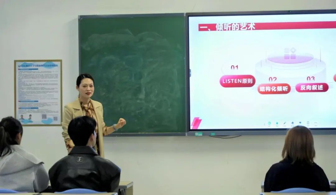 在“实用口才艺术”的课堂上,孙雨佳系统地讲解了社交口才技巧。课程伊始,孙老师通过 “找相似” 的课前热身环节切入,提出话题引入可以从周围道具、交流对象等方面入手,利用“说、问、说”的方式推进聊天进程。随后,她结合大量生活场景和实际案例,深入探讨了沟通、拒绝、安慰等日常生活常见语境中的口才艺术原则与方法,让学生们能够更好地掌握社交口才技巧,极大地增强了课堂内容的实用性。