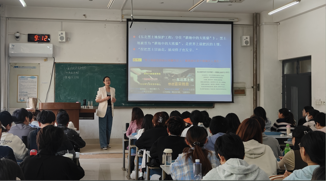 本次观摩课由刘琳老师主讲,授课内容为土壤腐殖质。课程聚焦土壤有机质的概念、分类、胶体特性、分子结构与品质评估标准,深入讲授了土壤腐殖质与土壤碳循环、重金属钝化和肥力缓冲等生态功能的关联,同时,结合“耕地中的大熊猫”东北黑土退化等案例,引发了学生关于“土壤腐殖质与土壤供肥保肥能力之间的关系”的相关思考。刘琳老师采用启发式教学,借助多媒体演示与课堂互动,引导学生构建知识框架,培养了学生的学科思维。课堂教学环节完整流畅,包含课堂导入、案例分析、讲解、提问、小组讨论和归纳总结等环节,课堂内容丰富多彩。小组讨论环节,每个学生都积极参与讨论,互相学习,赋予了学生探索的空间,其创新的教学设计和扎实的专业功底,为青年教师提供了生动的教学范式。