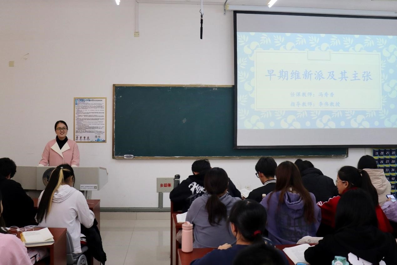 首场公开课由青年教师冯秀香进行讲授。在李伟教授指导下,冯秀香老师以“早期维新派及其主张”为题,从早期维新派的身份构成、思想主张、思想评价三个方面进行系统讲述。在充分运用史料、图片资料、表格等教学资源的基础上,细致解析了王韬、容闳、郑观应、薛福成、马建忠、陈炽、陈虬等早期代表性维新人物的成长经历与思想主张,并由此引申出早期维新派的两种身份构成以及群体特征,重点指出其与洋务派的复杂关系。本课通过师生互动的方式,学生讲述与老师点评补充相结合,充分调动起学生参与学习的积极性与主动性。