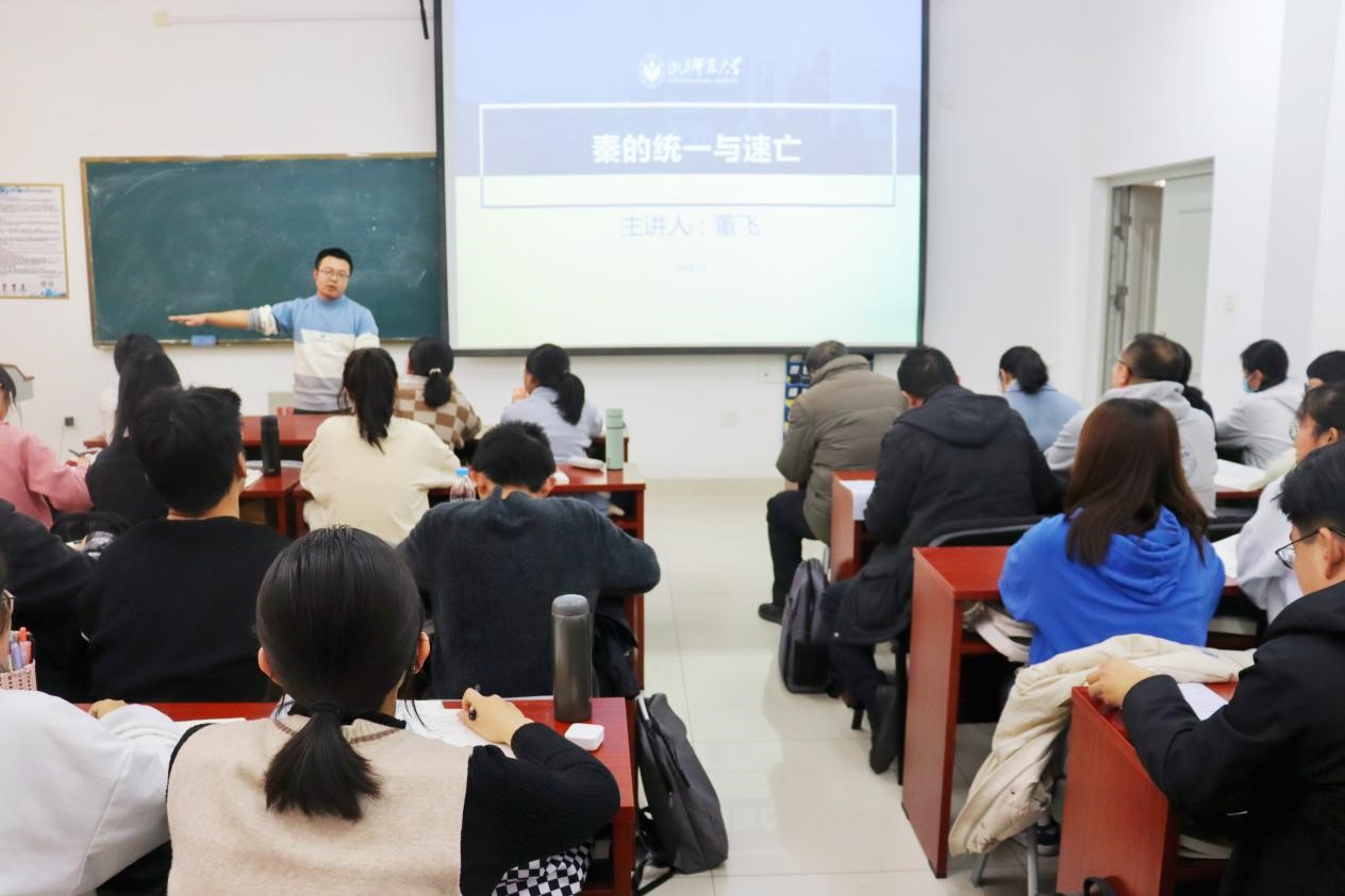 第三场由学院青年教师董飞进行讲授,在陈艳玲副教授指导下,董飞老师以《秦的统一与速亡》为题,从“邯郸之战与嬴政的出生”“始皇亲政与统一六国”“大一统帝国的政治”“秦的速亡”四个方面展开论述。不仅在对始皇身世、秦灭赵国等具体事件上有较为生动的讲述,在秦朝迅速灭亡的原因等方面也提出独到见解,开拓和增强了学生们的史学视野与素养。