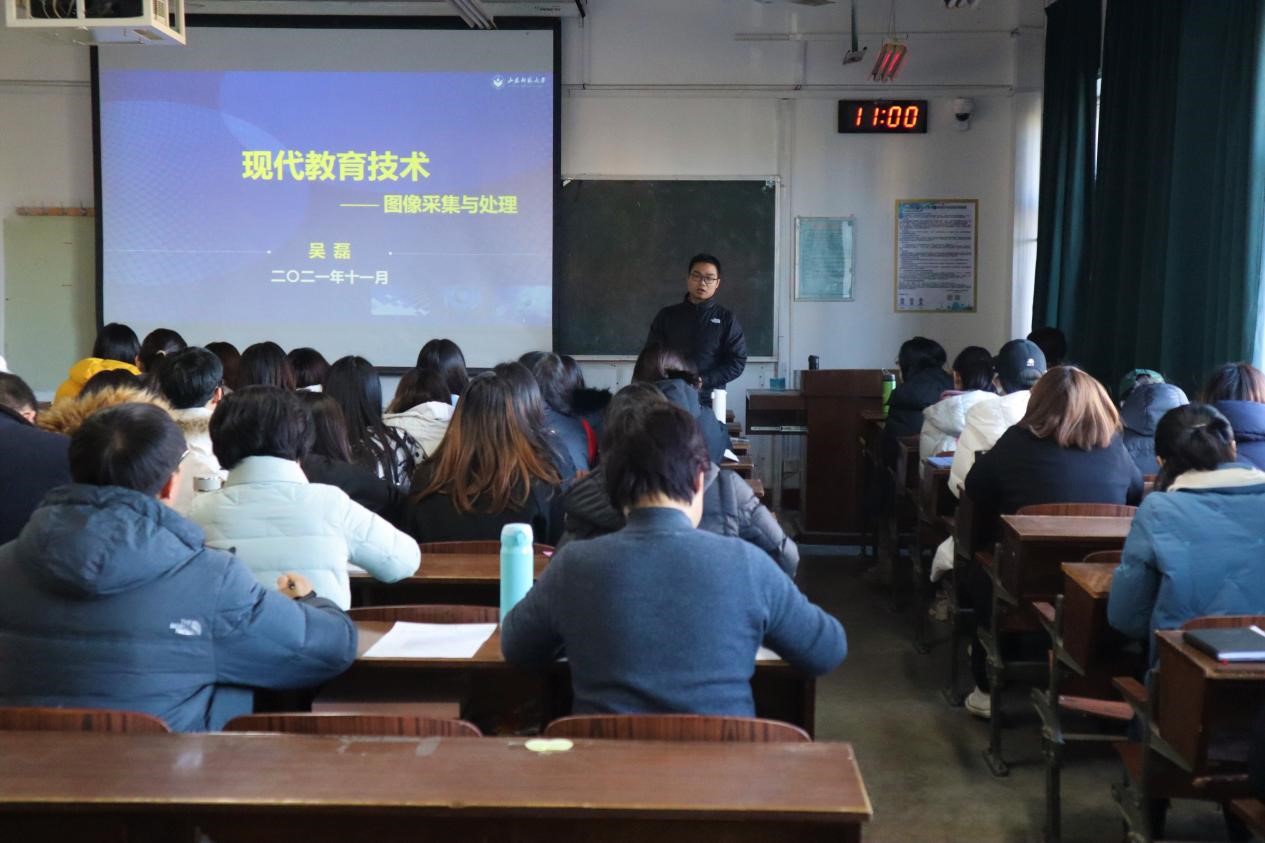 为帮助2021年首开课教师树立正确的教学理念,形成端正的教学态度,了解本科课堂教学规律和要求,夯实教学基本功,成功站上讲台,11月22日上午,教育学部于千佛山校区田家炳楼4429教室开展了首场“启航课堂1+1”公开课活动。学校教学督导组专家马军英教授、赵建民副教授、教师教学发展中心教学督导科岳爱峰老师应邀出席此次活动。教育学部副部长路书红教授,学部教学督导组主持工作副组长兼教师教学发展中心副主任王春华教授,督导组成员王向华、王红艳、陈大兴、张莉、崔春龙等老师,指导教师陆宏教授和教研室负责人韩晓玲副教授均参加了此次活动,近五年入职的部分青年教师也全程参与了观摩学习。本次公开课由学部教育技术系青年教师吴磊博士主讲,所讲课程为公共必修课《现代教育技术》。