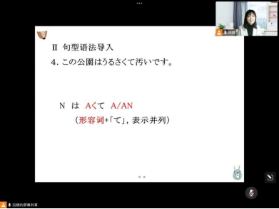 此次教学展示的主讲教师为日语专业青年教师田嫄博士,其主讲的课程《基础日语1》不仅重视培养学生学习日语的兴趣,夯实学习基础,而且注重提升学生的综合素养。田老师的授课紧扣预设教学目标,结合学生实际,运用了多种信息技术手段进行新课知识讲授,克服了线上教学的局限性,授课内容充实,学生参与度很高,教学效果良好。