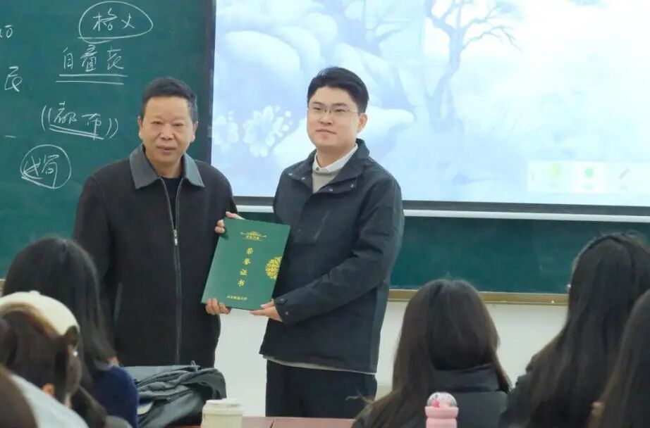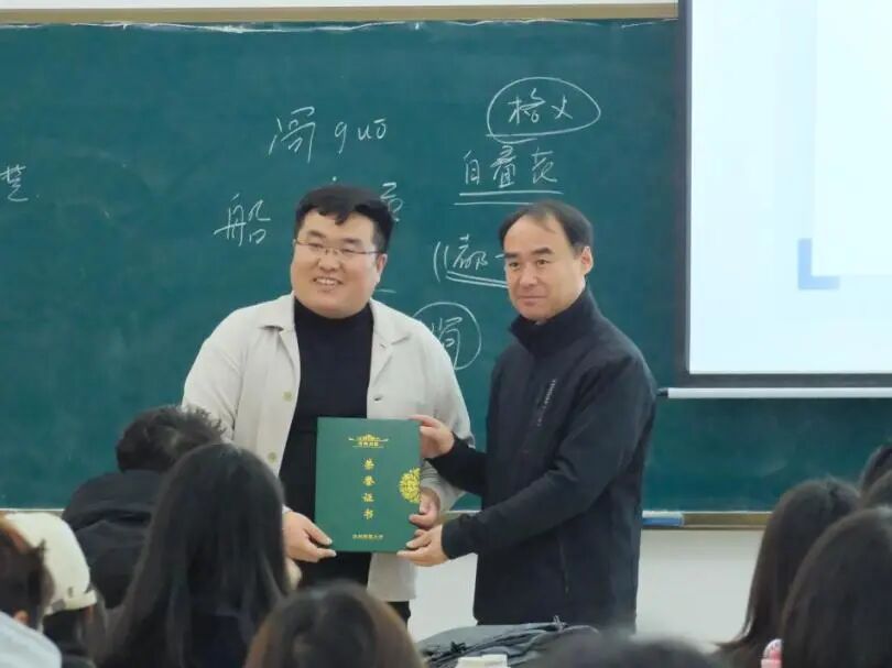 在课程后半段,雒老师又列举其他方面的生动案例阐释文化融合的精神体现,分析了中国文化延续的地理环境因素,并抛出“三夷教为何不能在中国扎根?”等思考问题,同时关联“第二个结合”的当代价值,点明历史经验对当下文化建设的借鉴意义。这场公开课互动氛围浓厚,内容引人入胜。雒晓辉老师凭借独特的教学风格,带领同学们清晰梳理中华文化的历史脉络,有效深化了学生对历史文化交融内涵的理解。课程结束后杜学霞主任、楼建军教授分别为雒晓辉老师及其指导教师宋化玉老师颁发了荣誉证书。