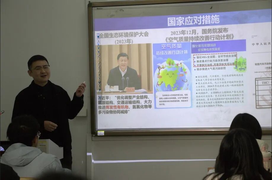 在课堂展示环节,刘昊老师围绕饱和烃(烷烃)展开教学,深入讲解了烷烃的来源(如石油、天然气、甲烷冰等)、结构及同分异构现象,系统梳理了烷烃的命名方法,同时详细阐述了烷烃的物理性质与化学性质。此外,老师还结合生活实际与环境问题,并引入《空气质量持续改善行动计划》中针对VOCs减排的国家政策,引发学生对烷烃类物质应用价值与环境影响的辩证思考。刘昊老师的讲解不仅搭建了从有机化学基础理论到实际生活、环境治理的桥梁,有效激发了同学们对饱和烃乃至有机化学领域的学习兴趣,更通过对烷烃结构分析的严谨逻辑、命名规则的规范要求,以及环境问题与政策应对的现实关联,培养了同学们严谨的科研态度与理论联系实践的能力。